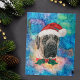 Engelska Mastiff Breed Hund-julen har en vattenfärg av en engelsk Mastiff med en röd julklapp, en röd julklapp och en galaxisk vattenfärg.