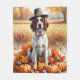 En vattenfärgsmålning stil av ett muntert sitta i hund i en hög av pulserande höst löv, omgiven av små pumpor och spridda hörn. Hund bär lite pilgrimhatt och beams med glädje, och fångade Thanksgivingens anda. I bakgrunden skapar mjuk skörd fält och träd med gyllene hud en fredlig landskapsambians. Struktur och varma, nedsmutsade hösttonar ge är en mysigt, nostalgisk perfekt för att fira säsongens skönhet.