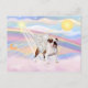 En brun och vit engelsk bulldog provar ut vingar bland himlens fluffa moln innan de kan komma in i Rainbow Bridge där änglar och vänner väntar.l