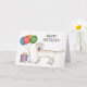 Utformning av matlagningsmatemat med Desteis ursprungliga tecknad illustration av en söt engelsk grädde jackar färg Labrador Retriever-hund. Bredvid hund finns det färgstarka födelsedagsballonger som är bundna på ett hund ben och en lila och gult färg. Bakgrunden har en lekfull mönster av färglösa pastellkonfetti på vit bakgrund. Det finns också ett anpassningsbara textområde som nu lyder: "Grattis på födelsedagen!".