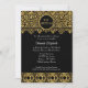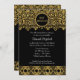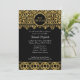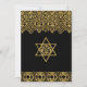 Elegant och sofistikerad grandeur för din speciella dag. Det moderna upptaget på en vintage Art nouveau stil skulle lätt kunna skänka en engelsk Manor House Stil eller ett formellt tillfälle. Den här designen visas här för ett Bat mitzvah firande och finns i dessa andra kategorier: Födelsedagsfest, nyliberaler, bröllopsinbjudningar och Möhippor. Finns även i en rad färg. Bakgrunden är ett mjukt, åldras, nyttigt blommönster i två svarta nyanser. Snöre-liknande gräns återges i ett mycket realistiskt tittar fack i guld glitter med dubbla ljusgnistor. En Art Deco ram med snabba scrollsar i svart och guld stryper titeln på ditt evenemang. På motsatt sida är en vacker stjärna av David symbolemblem. Mallen fält är enkel att anpassa för din egen personlig-inbjudan.