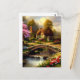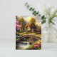 AI genererade bild en engelsk stuga med ett tak, ett litet vattenfall framför sig, blommor på flodbanken, en stenbro över floden och ett träd med rosa blommar.