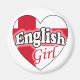 Leuke magneet met een hart afgebeeld met de engelse vlag erop. Op de tekst staat: Den engelska flickan De achtergrond är i de kleur wit. Leuk om te geven als cadeau of voor jezelf om te laten zien dat je dragbent om Engels te zijn. kleuren: rood en wit.