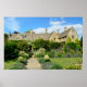 Poster utskrift av en manor, ett stort engelskt hus, med en blomsterträdgård och en väg i Chipping Campden i Cotswets, England, Storbritannien.