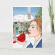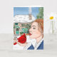Handritad konst. Den första snön. En dam som håller en kardinal på en snöig vinterdag framför en engelsk stuga. Tom kort.