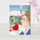 Handritad konst. Den första snön. En dam som håller en kardinal på en snöig vinterdag framför en engelsk stuga. Tom kort.