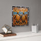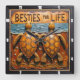 This striking square wall clock features a highly dimensional illustration of two orange sea turtles side-by-side. The entire design is rendered in bright orange, yellow, and blue tones, strongly suggesting a carved relief or Engraved Wood Look. The turtles have highly detailed, textured shells and are positioned on a textured sandy shore. A blue and orange ocean horizon is visible directly behind the turtles. The artwork includes small stylized star or sparkle shapes scattered across the sand. The large, three-dimensional embossed text "BESTIES FOR LIFE" is carved across the top. The clock face features a simple clock face border with large, white, numbered tick marks (1 to 12). The artwork is surrounded by a dark, textured decorative border that resembles a black wood frame.