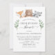 Skogsdjur - björn, rasism, fox Eucalyptus Grey Botanical Watercolor Vår Gender Neutral Pojke eller Flicka Baby Drive by Baby Shower vid en Avstånd inbjudan på vit bakgrund - innehåller vacker och elegant manustypografi med modern botaniska löv och gieneri för att speciella Mor ska vara firande.
