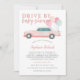 Stäng av ljudet genom att bjuda på ett inbjudningskort för babydusch med en illustration av en rosa vintage bil med ballonger. I texten står det "drick genom babydusch". Perfekt för en flickas körning genom dusch medan du avstånd social.