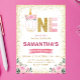 Inbjudan till enhörningens 1-års födelsedag med rosa blommor i guldglitter