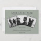 Meddela din vigsel- eller bröllopsdag till vänner och familj med detta moderna förhandsbesked om datum med enkel 3-fotocollage. Meddelandedesignen har tre fotoutrymmen för det lyckliga paret, ren textdesign och ett elegant diamantmönster på baksidan.