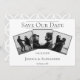 Meddela din bröllopsdag till vänner och familj med denna moderna Enkla 3 Fotoskollage Spara Datum. Tillkännagivandet har tre fotoutrymmen för det lyckliga paret, ren textdesign och ett elegant diamantmönster på baksidan.