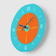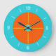 En ljus enkel klocka i akvablå med en rund bränd orange mitt. Denna köksklocka har siffror som matchar.