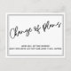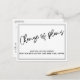 På framsidan finns ett grafikhuvud som jag designat med hjälp av en handskrift av avslappnaden, som lyder "Ändring av ritningar". Nedre, det finns ett glatt meddelande som du kan redigera och som förklarar dina nyheter: "Vi är fortfarande Gifta sig! Höger nu är vi inte säkra på när det kommer att hända." Texten visas i svart i förhållande till två smala gräns. Bakgrunden lämnades helt vit. Du kan ändra detta till valfritt färg om du vill ändra det. På baksidan finns mallplatshållare för information. Använda dessa fält att lägga till era personuppgifter och ändra mitt förslag till formulering till kostym för era behov och er situation.