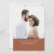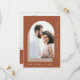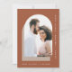 Med dessa enkla kort och elegant bröllop kan du spara datumkorten i ett modernt bågformat på en terracotta-bakgrund, med en annan neutralt-beige-båge som accent. Kortets baksida har plats för ytterligare ett foto, plus ett personligt meddelande från kort.