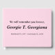 Denna grundläggande begravnings-/minneskondoleanser från gästboken innehåller budskapet "Vi kommer att minnas dig för all framtid" och datan namn i personlig och födsel/död för den person som har avlidit. Det skulle kunna användas för att registrera sympatisk önskemål för släktingar och vänner till någon som nyligen har avlidit. Texten är svart och bakgrunden färg är ljus rosa.