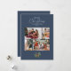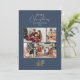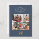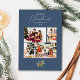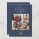 Ett enkelt julfotokollage-kort med en illustration av vattenfärgen gräs löv och helgdag och modern och elegant typografi på en dammblå bakgrund. Med en 4-fotokollage på framsidan för dina familjefotografier och ditt utrymme för att lägga till din familj namn, och ytterligare ett utrymme på baksidan för ett gruppfoto plus utrymme för att lägga till ditt eget personliga helgdag till dina kära i julhelgen!