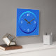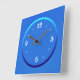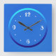 En enkel blå klocka med vita siffror.Denna enkla klockdesign har en akva- och mörkblå ring runt nosarna. Tillgänglig i fyrkantiga och runda former.Lämplig för ditt eget kök eller något annat rum i huset .Rekommenderas också som present vid speciella tillfällen.