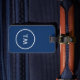 Elegant anpassade blå bagagetapp med vit cirkel och fet monogram.