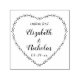 Lägg till en personlig finish på bröllopsinbjudningar, förlovningsannonser, tackkort, "spara datum"-kort eller bröllopsfavoriter med denna anpassade självfärgande gummistämpel. All text är enkel att anpassa eller ta bort. Designen har en rustik blomsterhjärtformad krans, handskriven stilspråklig kalligrafi med parets namn, datum och eventuell hälsning högst upp. Denna eleganta vintage botaniska gummistämpel är ett stilrent tillägg till din speciella dags firande. Perfekt även för en brudshow eller årsdag.