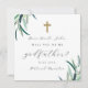 Enkla och moderna akvatellblad med kors botanisk fadder-förslags kort har "vill du vara min fadder" text med svart kalligrafi skrift typografi på en vit bakgrund. Detta fadder-förslag har en rustik minimal stil, med en grönbild på baksidan av kortet.