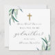 Enkel och modern botanisk fadderskap kort med "vill du vara min gudmor" text med svart kalligrafi skrift typografi. Detta fadderförslag har en rustik minimal stil, med grönska och ett foto på baksidan av kortet.