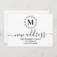 Enkelt och elegant svart botaniskt kransmonogram med svart typografi för detaljer om ny adress på vit bakgrund.