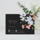 Enkel Boho Black and Rosa Blommigt-Bröllop OSA-kort - Elegant botanisk design med Rosa Script-typsbild. Lägg märke till er bröllop i stil med vår moderna boho-OSA kort som visar en fängslande blandning av blå och rosa blommor, kompletterad med lush grey på en slående svart bakgrund. Den botaniska utformningen av eleganten förstärks av användan av rosa-manustypografi, som tillför en liten bit romantik och sofistikering. Med en minimalistisk estetik balanserar denna unika OSA kort perfekt modernitet och naturskönhet. Fånga själva kärnan i din speciella dag med den här krävande kombinationen av blått, rosa, grönt och elegant-skripttypografi, som anger scenen för ett oförglömligt firande.