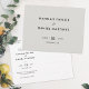 Denna enkla och eleganta rädda-datum-kort för bröllop har en tidlös, minimalistisk design. Standardinställningen för textfärgen på framsidan är svart, och standardbakgrundsfärgen är relaterad till ljusgrå toner. Du kanske föredrar att ändra basen till vit eller en annan nyans som du väljer. Du kan göra detta genom att helt enkelt välja en av de grundläggande färgerna med blotta ögat i redigeringsverktygen, eller så kanske du föredrar att lägga till ett specifikt hex-färgnamn som du har hittat under din research. Basen på baksidan av vykortet är inställd på att helt enkelt vara papprets färg, eftersom vi har valt att använda en klar bas med exempelt texten. Vi har inte valt någon färg. Observera dock att om du väljer att behålla et-tecken-symbolen på baksidan mellan dina namn, kan den symbolens stil och färg inte ändras. Du kan lägga till en färg efter eget val på baksidan som bas, vare sig det är vitt eller något annat, och / eller ändra bakgrundsfärgen på framsidan enligt din smak. Du kanske vill göra dem båda till samma färg som du väljer, kanske vit eller något liknande eller en annan, helt annan nyans. Eller så kanske du föredrar en annan