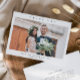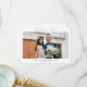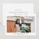Enkel bröllopsfototackkort med minimal typografi och foto på framsidan. Baksidan har ytterligare detaljer.
