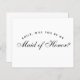Ett enkelt, minimalistiskt brudtärningsförslag: bara svart text på vit bakgrund. Orden Maid of Honor på framsidan och meddelandet på baksidan är skrivna med en elegant kalligrafisk skrift, den välvda texten "[Namn] vill du vara min" i små versaler.