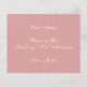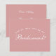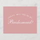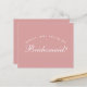 Det är bara vit text på dammig rosa bakgrund, en modern färg som är populär för brudtjejernas klänningar. Ordet Brudtjej på framsidan och meddelandet på baksidan är skrivna med en elegant kalligrafisk stil, den välvda texten "[Name] vill du vara min" ovanför ordet Brudtjej i små bokstäver.