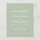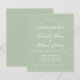 En enkel inbjudan till förlovningsfest med modern färg: sagegrön. Den har endast vit text på sagegrön bakgrund. Namnen är skrivna med en elegant kalligrafisk stil, resten med versaler. Den första raden är en välvd text.