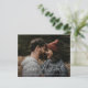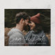 Denna moderna skript Bröllopsfotografi Save the Date har en elegant, minimalistisk design med för hand skriven save the date vit typografi på ett foto utan ram. Anpassningsbara detaljer och foto på framsidan. Baksidan erbjuder ett personligt meddelande. Klicka på knappen Redigera för att anpassa denna design.