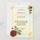 Enkel Burgunderröd Akvarell Blommig Bröllopsinbjudan. Inkluderar burgunderröda rosor, röda rosor och grönska bladverk - Burgunderröda blommor på baksidan. Välj Anpassa för att ändra informationen så att den passar din händelse innan köp.
