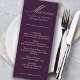Menykort för personligt bröllp. Enkel design för klassiska produkter och eleganter i lila som ska samordnas med färger i bröllop (sök i min butik efter alternativt färger eller klicka på "anpassa ytterligare" och ändra bakgrunden färg till kostym). Mallen är redot för att du ska kunna lägga till namn, bröllop-datum och menyn.
