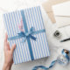 Den här presentfigursättningen i eleganten har ett enkelt, lodrät som raderar mönster med ett faux linen-utseende. Candy rand är en tidlös klassiker, perfekt för födelsedagar, helgdagar, babyduschar och presenter! Om du vill ha en traditionell beröring kan du prova att binda den med en rustik jute-sträng eller lägga till en finare-båge för en mer elegant känsla! Den här sömlösa presentfigursättningen i mönster finns tillgänglig på premiumkvalitet papper med en projektionsyta eller glansig avsluta. Tryckt färg: blått och naturligt vitt.