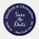 Skapa din egen anpassade, personliga, vackra eleganta typsnitt / manus, chic, marinblå och vit, röda hjärtan, brud och brudgum på bröllop sparad datum rund form kylskåpsmagnet. För att anpassa, skriv bara in namnet på bruden och brudgummen, bröllopsdatum samt stad och delstat. Medan du anpassar, kommer du att kunna se en förhandsvisning hela tiden. Perfekt för dina bröllopsannonsering "spara datumet" till vänner, familj och släktingar.