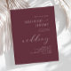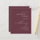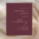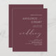 Den här enkla inbjudan från elegant bröllop innehåller ord "bröllop" i ett snyggt vitt skript. Anpassa den med namn i bruden och trimmen i vit serif-huvudstad brev (gått med med ord "och" i skript som matchar "bröllop") och den återstående texten i gemener med vit kursiv bakgrund på burgundbakgrund.