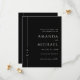 Det här klassiska svarta bröllop spara datum-kortet är enkelt, elegant och smakfullt och har en tunn linje gräns längs det lämnat kant med briden och triomens monogram som inledning. En kombination av teckensnittet för tidslinslös elegant parad med ett traditionellt skriptteckensnitt ger en enkel elegans till designen. Du kan lägga till, ta bort eller justera textens placering till kostym efter dina behov. Den ständigt populära svarta bakgrunden med svartvit text ökar den här designens renaste enkelhet. Dessa Spara datumet finns i både tryckt och papperslös digital-hämtningsform.