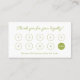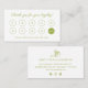 Ett enkelt ljust grönt visitkort för affärslojalitet med elegant med platshållare för tio besök eller beställningar. Baksidan har klassiskt manusmonogram, platshållare för din kontaktinformation och fyra medieikoner i social - Facebook, Instagram, Pinterest och YouTube (aktivera det på designnivå). Upprepa kunder genom att tacka dem och erbjuda en rabatt för nästa besök eller beställning med den här mallen för förmånskort för snyggt. © y.BEE PAPERIE #ZazzleMade #LoyaltyCardTemplates #PrintableLoyaltyCards #GreenLoyaltyCards
