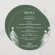 En elegant ständigt grön rund middagsmeny med vita julgranar presenterar dina meny detaljer i chic bokstavsstil. Perfekt för en högtidlig julfest eller någon speciell händelse med en sittande middag.