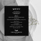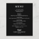 En svart middagsmeny presenterar din meny i snygg vit text. Perfekt för en modern bröllopsfest, bröllopsrepetition, årsdag eller någon speciell tillställning med en sittande middag. Ett utmärkt pris, tryckt på 80g obestruken matt vit papper som mäter 4,5" x 5,6", men du kan välja mellan 3 pappersstorlekar för din meny.