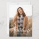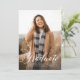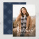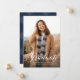 Det här enkla och klassiska examensmeddelandet har en stor vertikal bild och ordet "utexaminerad" i vit skrivstil tillsammans med utrymme för namn, år och andra skoluppgifter. Den matchande randiga baksidan är en klassisk marinblå.