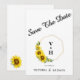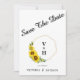 En elegant bröllopsinbjudan med en gyllene ram av glada solrosor.
