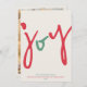 Dessa minimalistiska 5" x 7" julkort har hälsningen "glädje" i en stor röd och grön rolig teckensnitt med den ytterligare redigerbara hälsningen "Önskar er fred, kärlek och glädje denna högtid." Lägg bara till ditt familjenamn och år. Lägg till tre av dina favoritfoton på baksidan av kortet.