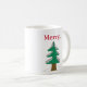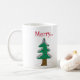 En vintage-design med ett Julgran med snöhaltigt grenar och några rödbubblor. En enkel grafisk design. Ord "Merry".. accentuerar det i ett rött helgdag.