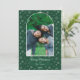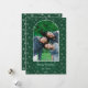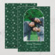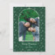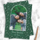 Detta enkla gröna God Jul snöflinga foto julkort har ett minimalt grafiskt mönster av vita snöflingor på en mörkgrön bakgrund i mitten är ett anpassningsbart foto i en båge form. Orden God Jul, familjen namn och året är under. Familjen namn och år är anpassningsbara.