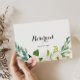 Detta enkla grönt i blommigt, barrträd bröllop, är perfekt för ett tropiskt bröllop. Utformningen har en underbar vit, rosa och handmålad ro inbäddad i gröntens blad, inspirerande konstnärlig skönhet. Dessa kort är dubblor och kan användas för att reservera stolar eller bord vid ceremonin i bröllop, vid mottagningen eller i vilket evenemang som helst.