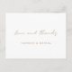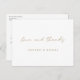 Denna stilrena bröllop tack-kort har "kärlek och tack" i en elegant guldton som heter California Gold i ett varmt, modernt skrivstil med gemener. Denna del av designen kan inte ändras. Du kan ändra färg eller teckensnitt eller storlek på någon av den andra texten. Standardtonen för namnen på framsidan är samma guld som "kärlek och tack" ovanför och standardfärgen för texten på baksidan är en grå ton. Vi har lagt till exempeltext på baksidan som du kan ersätta med ditt meddelande. Men vänligen känn dig inte begränsad av detta. Om du hellre vill göra baksidan tom så att du kan skriva en handskriven notis på varje kort istället, kan du göra det. Men se till att i vilket fall som helst ta bort vår exempeltext! Vi har inte valt en standardfärg för bakgrunden på någon av sidorna. Istället är standardinställningen genomskinlig för att låta papperets färg tjäna som baston. Du kan ändra detta genom att välja en färg i redigeringsverktygen om du vill för en eller båda sidor. En minimalistisk design som denna sätter papperet i en skarpare fokus och inbjuder dig att lägga till dina egna handskrivna ord på baksidan, vare